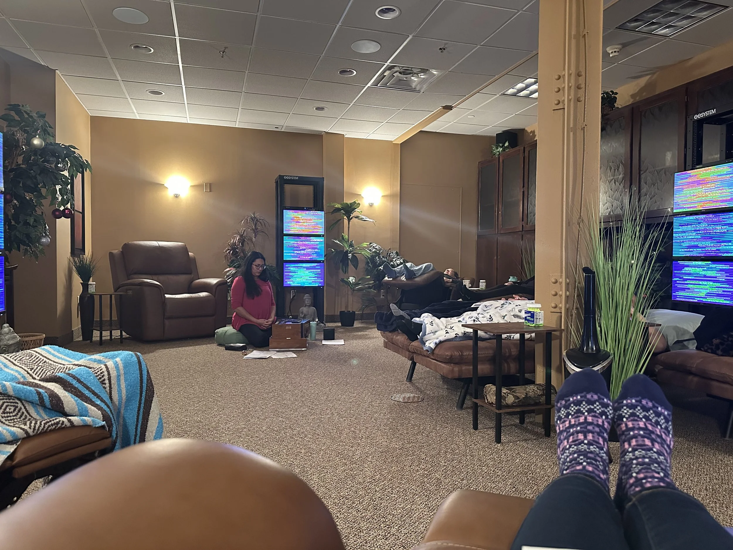 You may choose a comfy armchair, a zero gravity chair, a couch, or sitting the floor to participate. Get there early to get the seat you would like.